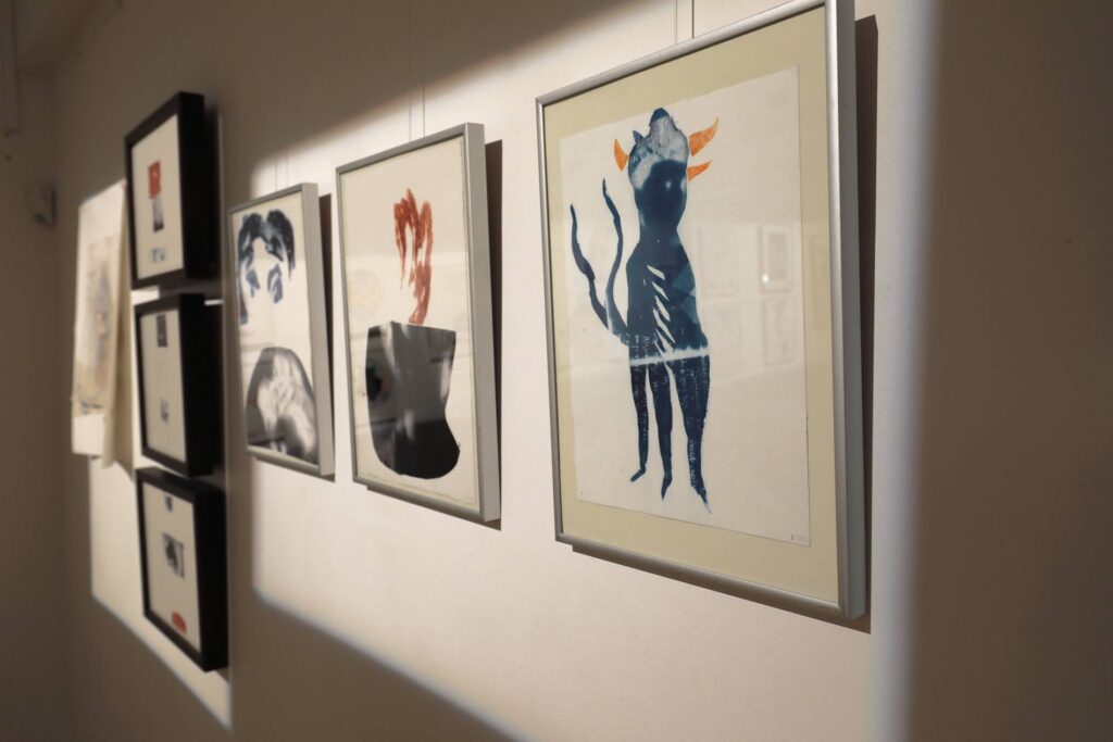 Dans cette présentation, j’ai misé sur un accrochage double : d’un coté les pièces encadrées, placées sur les murs et de l’autre – de grands dessins/collages accrochés librement sur des fils au milieu de la salle d’exposition. Je présente quatre grandes pièces, bi-face et quarante gravures/cyanotypes.